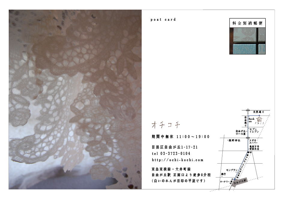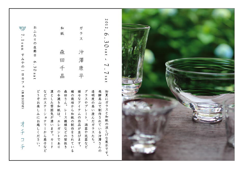 初春の文房具と茶道具展 (終了) 2011年1月8日(土)〜1月15日(土) ※1月11日(火)は休み 10:00〜19:00 (最終日17:00まで) 火曜定休日 器の店 ノーション 東京都国立市中1-10-8 042-573-3449 ホームページ 年もあらたまり、2011年のスタートライン。 今年最初の展示は、気分を新たに手紙を書いたり 気持ちを鎮めて美味しいお茶をいただいたり。 自分の時間を豊かにするための、道具展です。 ![]() ・空沼工房---(木) ペーパーナイフ、クリップ、ストラップなど ・高野恵---(ガラス) 硯、ペーパーウエイトなど ・武内裕---(磁器) 抹茶碗、香合、銘々皿など ・谷関薫---(漆) 盃、箸、箸おきなど ・塚村剛---(ガラス) 硯、文鎮、水滴など ・遠見和之---(能登仁行和紙) 手漉き和紙、はがきなど ・ムラタカオリ---(陶器) ペン立て、花器、箱など ・目片千恵---(ガラス) 硯、筆おき、インク壷など ・森田千晶---(手漉き和紙) カードセット、名刺、はがきなど ・森友見子---(再生紙) 小箱いろいろ ・吉橋玄雄---(表具師) 掛軸、額など < アイウエオ順> ※その他、骨董の抹茶碗などの茶道具も New Year Greetings 展 2011 (終了) 2011年1月8日(土)〜1月15日(土) 12時〜19時 (最終日は18時まで) 会場=ギャラリーみずのそら 東京都杉並区西荻北5-25-2 ホームページ 03-3390-7590 活版、グラフィックデザイン、写真、イラストレーション、 版画、製本、カリグラフィー…… さまざまな分野で活動している方々から送っていただいた年賀状を展示します。 それぞれの思いで作られた年賀状の一枚一枚を、見て触って、お楽しみください。 ![]() (参加者) 赤井都 / 浅井陽子 / あちらべ / atsumi / Anna Gleeson / あべちほ / 阿部真弓 / イイダ傘店 / 伊香英恵(A.A.E.textiles)/ 石曽根昭仁 / 伊藤絵里子 / 稲垣早苗 / 井上沙紀 / 井上陽子 /イマジョウデザイン/ 入澤花絵 / 岩瀬敬美/ UZ DESIGN FACTORY / 大浦美和 / 大塩あゆ美 / 大沼ショージ / 尾形かなみ/ 小熊千佳子 / 尾田美樹 / 尾柳佳枝 / 海岸印刷 / 角田光正 / 株式会社 真映 社 / 蒲田美佐子 / 亀井研二 / KAYU / 川口伊代 / 川島康太郎 / 川島雄太郎 / 川手眞理 / 川部重臣 / 神田亜美 / 菊地和広(バックヤード)/ 北村範史 / 九ポ堂 /guse ars/ 熊谷聖司 / Kumiko Hitomi[HI company Ltd.] / 小関祥子 / Kotoko KANETA / コトホギデザイン 池上直樹 / 小林和人(Roundabout/OUTBOUND)/ ごぼうデザイン事務所 / 坂本千明 / 佐藤未南子 /佐藤礼子(リュース オ ボウ)/ 三戸美奈子 / 島谷美紗子 / しゅんしゅん /菅原広夢 / STORE / 瀬戸直 / 武井実子 / 巽紀子 / charmy(小池雅美)/ 創る和紙職人ハタノワタル / 都筑晶絵 / Zwillinge / ツバメ活版堂 / 富田惠子 /トランクデザイン 堀内康広 / 内藤雅光 / 中澤季絵 / 長沢暁 / 中田真央 / 中村綾緒 / 西本良太・葉田いづみ / 二宮郁子 /knoten/ 芳賀八恵 / ハナブサプレス 両見英世 / fancomi / FALL・三品輝起 / 福室みずほ / 藤川孝之 / ふじくらみほ / 史緒 / フルタヨウコ / 文京れんげ社(宇佐美智子/大木陽子)/ BEKA / 宝珠光寿 / 星幸恵 / 本の島 絵はがき部 / 正成美雪 / 益永梢子 / 松永かの / 松本亜季 / 丸山佐知子(Blackchrom)/ 萬田康文(Monday Books)/ みやしたゆみ / 宮島信太郎 / 村橋貴博 / megropress / 百田智行 / 森岡書店/ 森田千晶 / 森雅代 / 山下桂樹(CATALYZE DESIGN)/ 山田理加 / 山之口正和/ 山元伸子(ヒロイヨミ社)/ 有限会社コスモテック / 吉田昌平 / 米谷明香 / 龍骨堂 伊東久美 / Little Hello / リン版画工房 / LUFTKATZE / 和田祐子 / and more...... Birneのクリスマスマーケット 2010.12.11sat-19sun (終了) Birne 埼玉県ふじみ野市川崎1-1-2 / 049-266-2964 ホームページ ![]() 石川覚子/ICHI/saiho/坂口なお/染色工房や・や・も 坂本美雪/しらつちまゆみ/さくまポタリー/月日工藝 中村桜/BRIKIKKA/前田美絵/松尾由美/宮崎桃子 ムーンラビット/持永貞子/森田千晶/Birne ほか 静かで暖かなビルネのクリスマス。陶器やガラスの 器やオブフェ、アクセサリー。フェルトや布の小物、 ショール、バッグ。クリスマスカードやカレンダー、 焼き菓子やシュトレンなどがならびます。 とっておきの贈り物をさがしに、ぜひお出かけください。 森田千晶 「和紙でおくりもの」 (終了) 2010年11月30日(火)〜12月13日 (月) 銀座松屋 7階 スタイルコレクションイベントスペース 東京都中央区銀座3-6-1 ホームページ 現代の「くらし」の中にも和紙を!と日々提案しています。 レースやドイリーの透かし和紙を中心にステーショナリーやランプ、 かべかけなどのおくりものをぜひ見つけにいらしてください。 ![]() 紙でつくる (終了) 2010年10月23日(土)ー31日(日) Birne 埼玉県ふじみ野市川崎1-1-2 /tel 049-266-2964 /ホームページ ![]() 青池茉由子[文字がテーマの作品] しらつちまゆみ [カード・オブジェ] 中口祐介 [版画・コラージュ・カード・ミニブック] ノラヤ [カレンダー・カード・旗] BRIKIKKA [カレンダー・カード・写真etc] 藤井美絵 [ファイル・名刺入れetc] 森田千晶 [カード・レース/ドイリー和紙etc] ルリユール[装丁] Birne [ノート・メモパッドetc] 第2回 堺クラフトフェア 〜灯しびとの集い〜 (終了) 2010.10.30(土)/31(日) 大阪府堺市 大仙公園 灯しびとの集い公式ホームページ ![]() The Kni