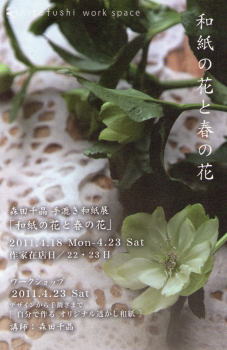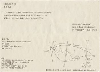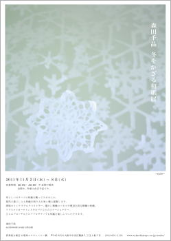 森田千晶 手漉き和紙展 「和紙の花と春の花」(終了) 2011年4月18日(月)ー4月23 日(土) 11:00-18:30 hitofushi [ひとふし] ホームページ 大阪市西区京町堀1-12-28 壽ビル1階 06-6225-7675 在店日/22(金)・23(土) ![]() ワークショップ デザインから手漉きまで [自分で作る オリジナル透かし和紙] ご自分でデザインした透かし和紙を手漉きしていただきます。レースの和紙って どんな風にできるの?ワークショップを通してほんの少しのぞいてみませんか。 和紙作りの材料、基本的な工程なども学んでいただけます。 4月23日(土) 午前の部/10:30〜 午後の部/14:30〜 いずれも2時間程度、各定員9名 お問い合わせ:hitofushiまで てしごとのしおり 〜出版記念展覧会〜 (終了) 2011年1月19日(水)〜30日(日) ※1月25日休み 11:00〜19:00 (火曜定休) cholon [チョロン] 東京都渋谷区恵比寿西1-31-12 FLEG代官山1F 03-5456-4465 ホームページ 森田千晶(手漉き和紙) 高澤恵美(横振り刺繍) 伯兆(螺鈿蒔絵) 雑木囃子(箱根寄木細工) ![]() 手漉き和紙、横振り刺繍、螺鈿蒔絵、寄木細工、どれも日本に伝わるものづくりの技法です。 そんな伝統的な技を受け継ぎながらも、今の生活にとけ込むような作品を作り出す4組の作家たち。 本の中で紹介した4組の作家の作品を実際に手に取って見て頂きたいと、作品展を開催することになりました。 ぜひご覧ください。